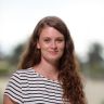Eine Frau hält ihre Hände auf einen grißen Tisch mit vielen getrockneten Kakaobohnen