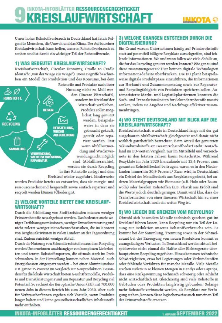 Doch was genau ist mit Kreislaufwirtschaft gemeint. Welche Vorteile bietet sie im Vergleich zur linearen Wirtschaft? Wie weit ist Deutschland mit Blick auf zirkuläres Wirtschaften? Welche konkreten Maßnahmen sind nötig, um den Rohstoffverbrauch wirklich zu senken? Das INKOTA-Infoblatt Kreislaufwirtschaft klärt diese und weitere Fragen rund um Chancen, die durch die Digitalisierung entstehen. Aber auch, wo die Grenzen von Recycling liegen und was für eine global gerechte Rohstoffwende nötig ist.