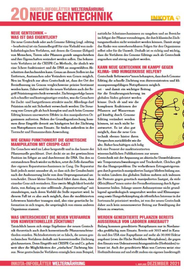 Wie genau funktionieren Methoden wie CRISPR-Cas und welche Chancen und Risiken bergen sie? Sollten entsprechend manipulierte Organismen als gentechnisch verändert gekennzeichnet und gesetzlich reguliert werden? Und was ist dran an dem Versprechen, mit neuer Gentechnik den Hunger zu beenden? Diese und weitere Fragen beantworten wir im INKOTA-Infoblatt. Darüber hinaus zeigen wir, wie INKOTA-Partner*innen selbst Saatgut herstellen und vermehren, das an die Klimakrise angepasst ist. Und für alle, die selbst aktiv werden wollen, geben wir Praxistipps.
