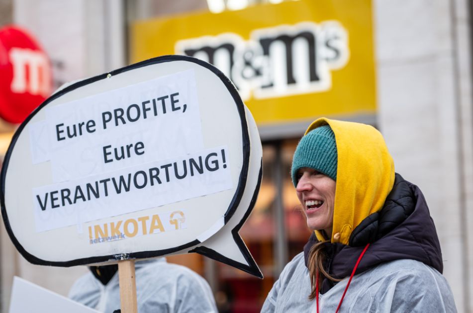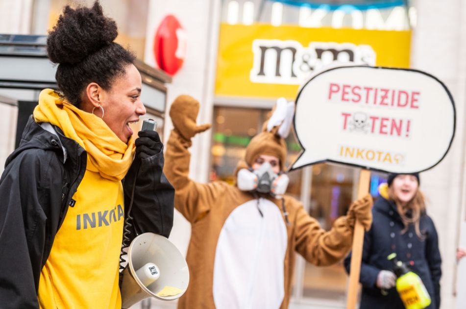 Gemeinsam mit Unterstützer*innen der Kampagne Make Chocolate Fair! machte INKOTA auf die Auswirkungen des gefährlichen Pestizideinsatzes im Kakaoanbau aufmerksam. Schokounternehmen müssen endlich Verantwortung übernehmen und Menschenrechte in ihrer Lieferkette einhalten – durch das deutsche Lieferkettengesetz sind sie auch gesetzlich dazu verpflichtet. Fast ein Jahr lang hatte Mars die Forderungen der Verbraucher*innen sowie die Gesprächsangebote seitens INKOTA ignoriert. Erst als INKOTA zum Protest vor dem M&M Store aufrief, waren Vertreter*innen von Mars zu einem persönlichen Gespräch über die gefährlichen Auswirkungen des Pestizideinsatzes in der Kakao-Lieferkette mit uns bereit.