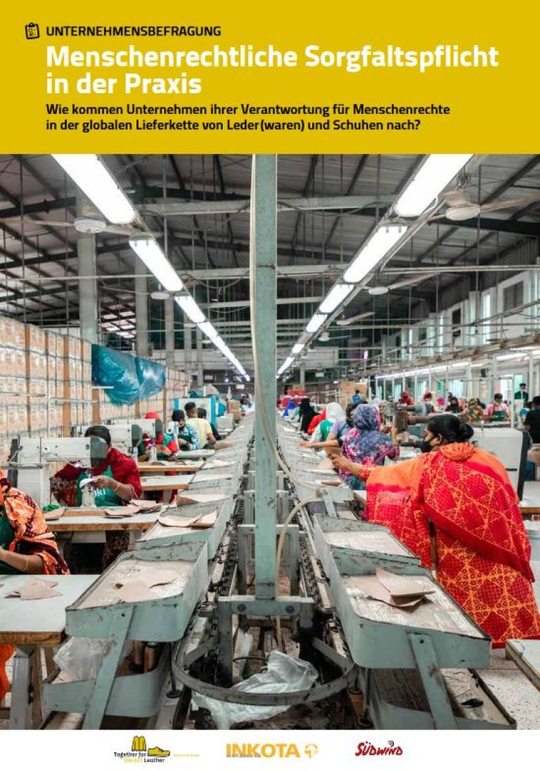INKOTA setzt sich seit 2020 in dem Bündnis Together for Decent Leather, bestehend aus sieben NGOs in Europa und Asien, für bessere Arbeitsbedingungen in den Produktionsstandorten für Lederprodukte in Südasien ein. Unser Ziel ist es, die Arbeits-und Lebensbedingungen der Leder-und Schuharbeiter*innen in Bangladesch, Indien und Pakistan zu verbessern und die Missachtung von Menschen- und Arbeitsrechten bei der Herstellung von Leder und Schuhen zu verringern. Wir arbeiten daran, dass Unternehmen der Schuh- und Lederindustrie endlich Verantwortung für die gesamte Lieferkette übernehmen und dafür sorgen, dass Arbeiter*innen zu ihren Rechten kommen. Deshalb setzen wir uns dafür ein, dass die Politik verbindliche Regeln schafft, die die Unternehmen zur Einhaltung von Arbeits- und Menschenrechtsnormen verpflichten.